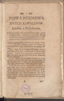 Title: Nowa Rozmowa Dwuch Kawalerow Katolika z Dyssydentem : O nowym piśmie przydanym do dawnieyszego praw Dyssydenckich wykładu, z napisem: Uwagi nad stanem teraźnieyszym Dyssydentow w Polszcze, wiernie iako y pierwsze spisana R. 1767